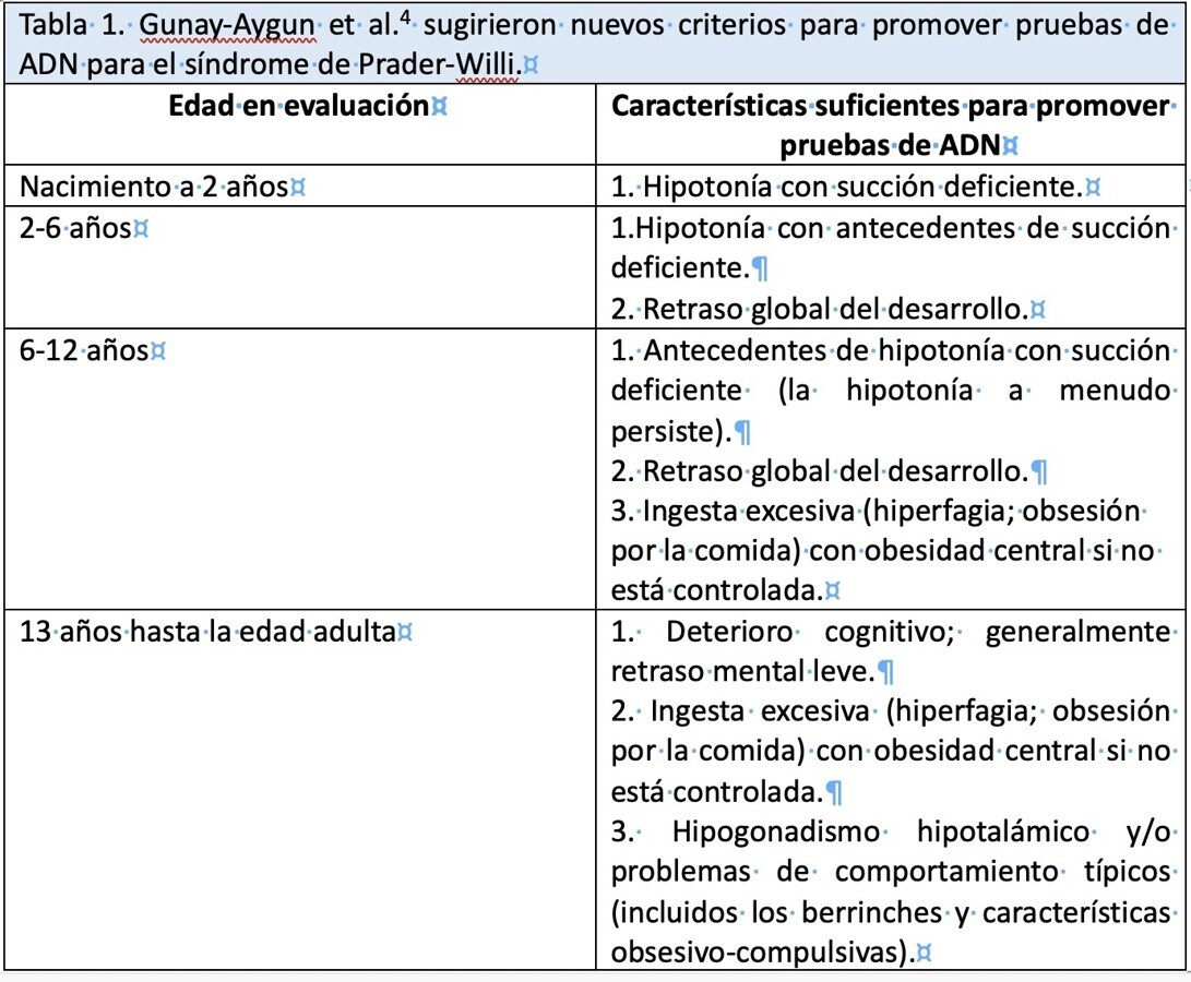 El síndrome de Prader-Willi es un trastorno genético poco común que ocurre aproximadamente en 1 de cada 10,000 a 30,000 nacimientos1. Es causado por una anomalía en el cromosoma 15q11-q13, incluyendo deleción intersticial paterna, disomía uniparental materna y defectos de impronta2.3. El diagnóstico se confirma mediante pruebas genéticas, aunque existe una relación entre las características clínicas y el rango de edad del paciente con SPW (Tabla 1). Este síndrome se asocia con una serie de variedad de problemas médicos, cognitivos y de comportamiento que varían según la edad del paciente.