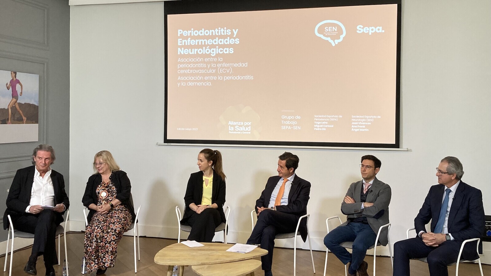 Los participantes en la presentación del informe conjunto SEPA-SEN sobre la relación entre periodontitis y enfermedades neurológicas: El Dr. Miguel Carasol, coordinador de los grupos de trabajo de SEPA, la Dra. Ana Frank, jefe de Servicio de Neurología del Hospital Universi-tario La Paz; la Dra. Paula Matesanz, vicepresidenta de SEPA, el Dr. José Miguel Láinez, pre-sidente de la Sociedad Española de Neurología, el Dr. José Vivancos, neurólogo y el Dr. Yago Leira, presidente de SEPA. (Foto: SEPA)