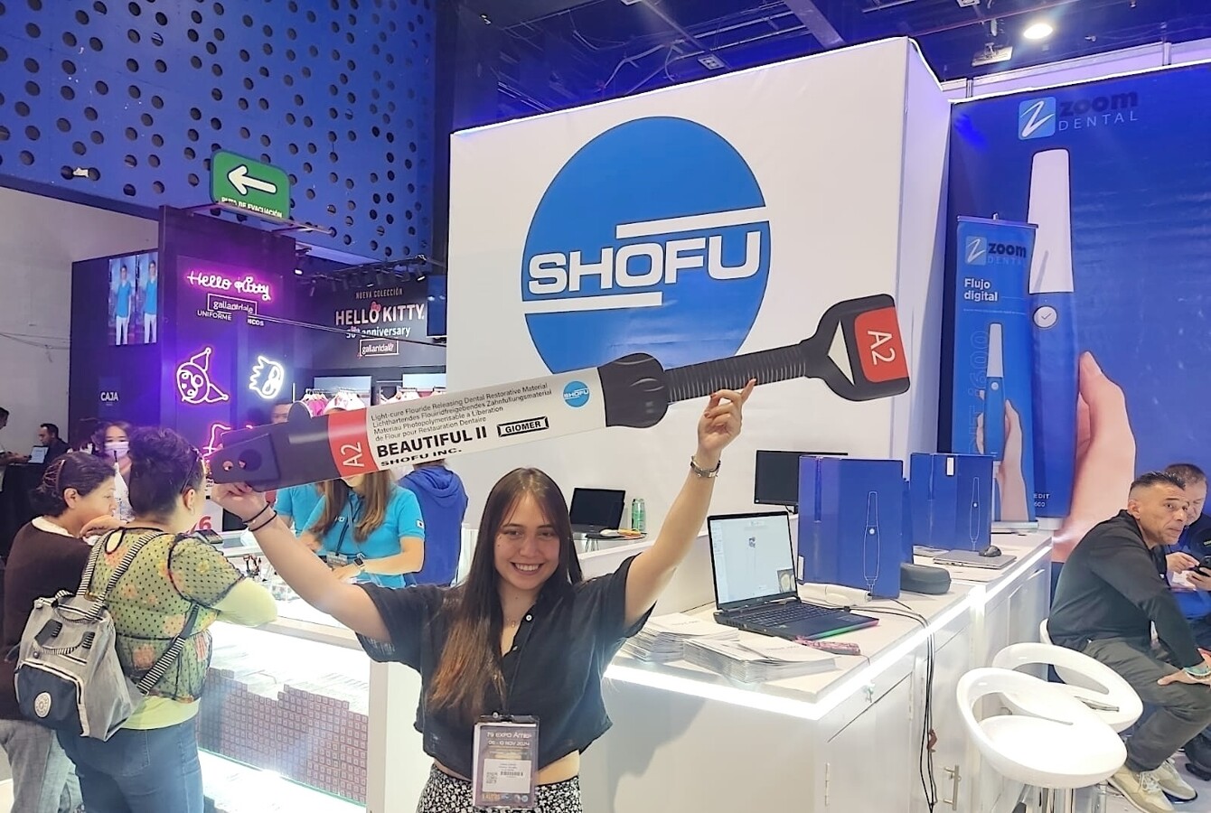 STAND. Una delegada de SHOFU México muestra orgullosa la jeringa de una resina en la exposición dental. Foto: Maritza de los Ríos