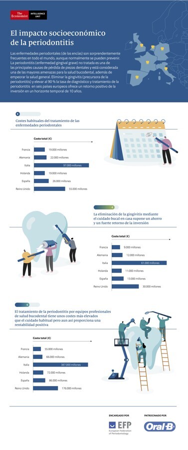 Las enfermedades de las encías como la periodontitis y la gingivitis tienen un enorme impacto económico, a pesar de ser relativamente fácil de prevenir. El reciente informe publicado en The Economist “Time to take gum disease seriously”, elaborado por la Federación Europea de Periodoncia (EFP) expone el coste económico y humano de las enfermedades de las encías. Si no se trata, la periodontitis puede empeorar la salud general; por otro lado, el informe concluye que eliminar la gingivitis y aumentar la tasa de diagnóstico y tratamiento de la periodontitis al 90% en 6 países europeos produce un retorno positivo de la inversión en los siguientes 10 años.
