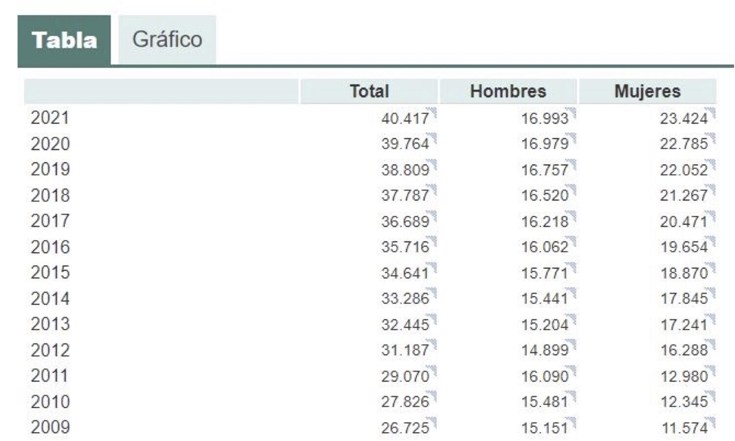 Tabla que muestra el aumento de mujeres dentistas de 2009 a 2021, según el INE.