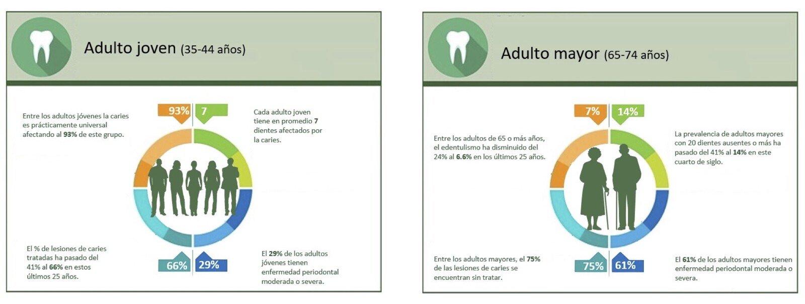 La Dra. Núñez informa de que, entre los adultos jóvenes (35-44 años), la caries continúa siendo prácticamente universal por su carácter acumulativo, “aunque se observa una moderada reducción del número de dientes afectados —actualmente, unos 7 por persona— y un mayor uso de servicios odontológicos, con un incremento de restauraciones del 49% al 66%”. Sin embargo, 3 de cada 10 personas en estas edades presentan periodontitis moderada o severa, por lo que desde el Consejo General de Dentistas recomendamos reforzar la prevención, especialmente en embarazadas y personas con patologías sistémicas. El Dr. Castro declara que la actual generación de 35-44 años se pudo beneficiar de los primeros programas preventivos y asistenciales en España, por lo que su nivel educativo en materia de salud bucodental es mejor, aunque la caries y la enfermedad periodontal continúan siendo muy prevalentes y queda patología sin tratar.