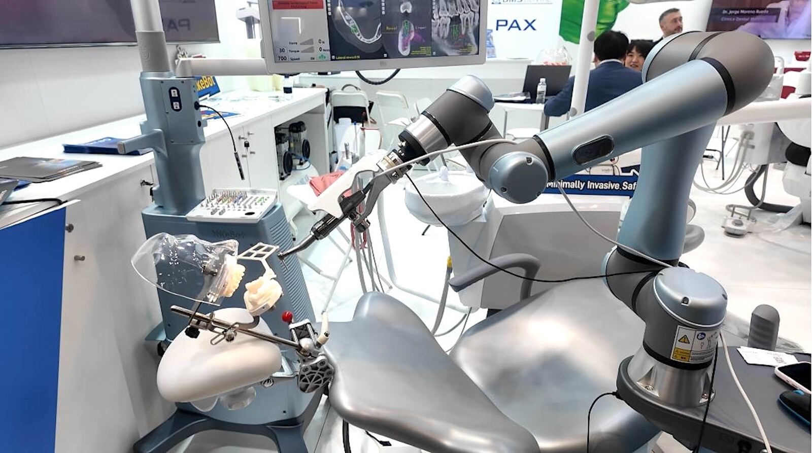 El reconocido implantólogo Jaime Franco Barbens escucha atentamente a una explicación de un nuevo robot para implantología, cuyo brazo se aprecia en la parte inferior de la imagen. Foto: Dental Tribune Spain
