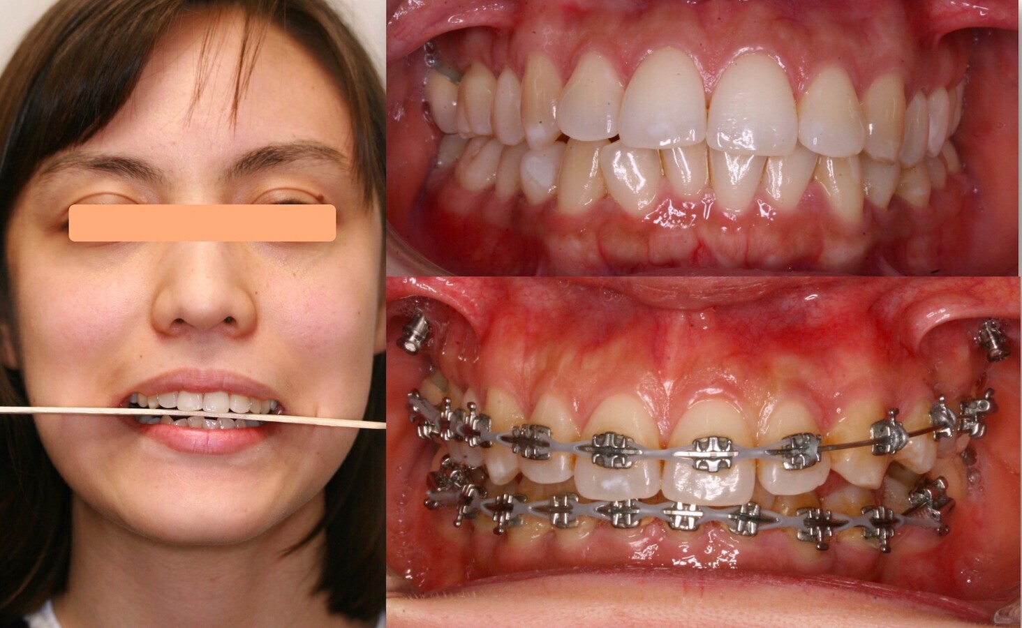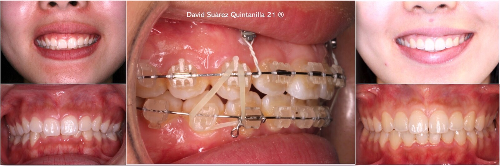 Figura 8. Gracias a los microimplantes (MI), debemos de replantearnos el concepto de ortopedia dentofacial y sus límites etarios. En la imagen, tratamiento con MI de una sonrisa gingival en una paciente adulta.