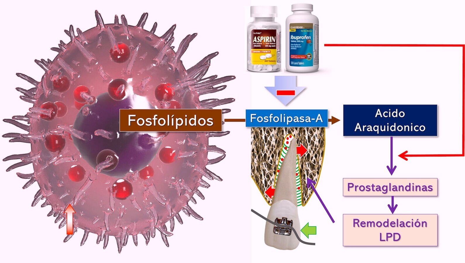 Figura 22. El consumo de aspirina o antiinflamatorios durante el tratamiento de ortodoncia puede producir una disminución, un enlentecimiento del MDO, por su acción sobre diferentes enzimas (ver texto).