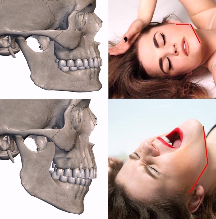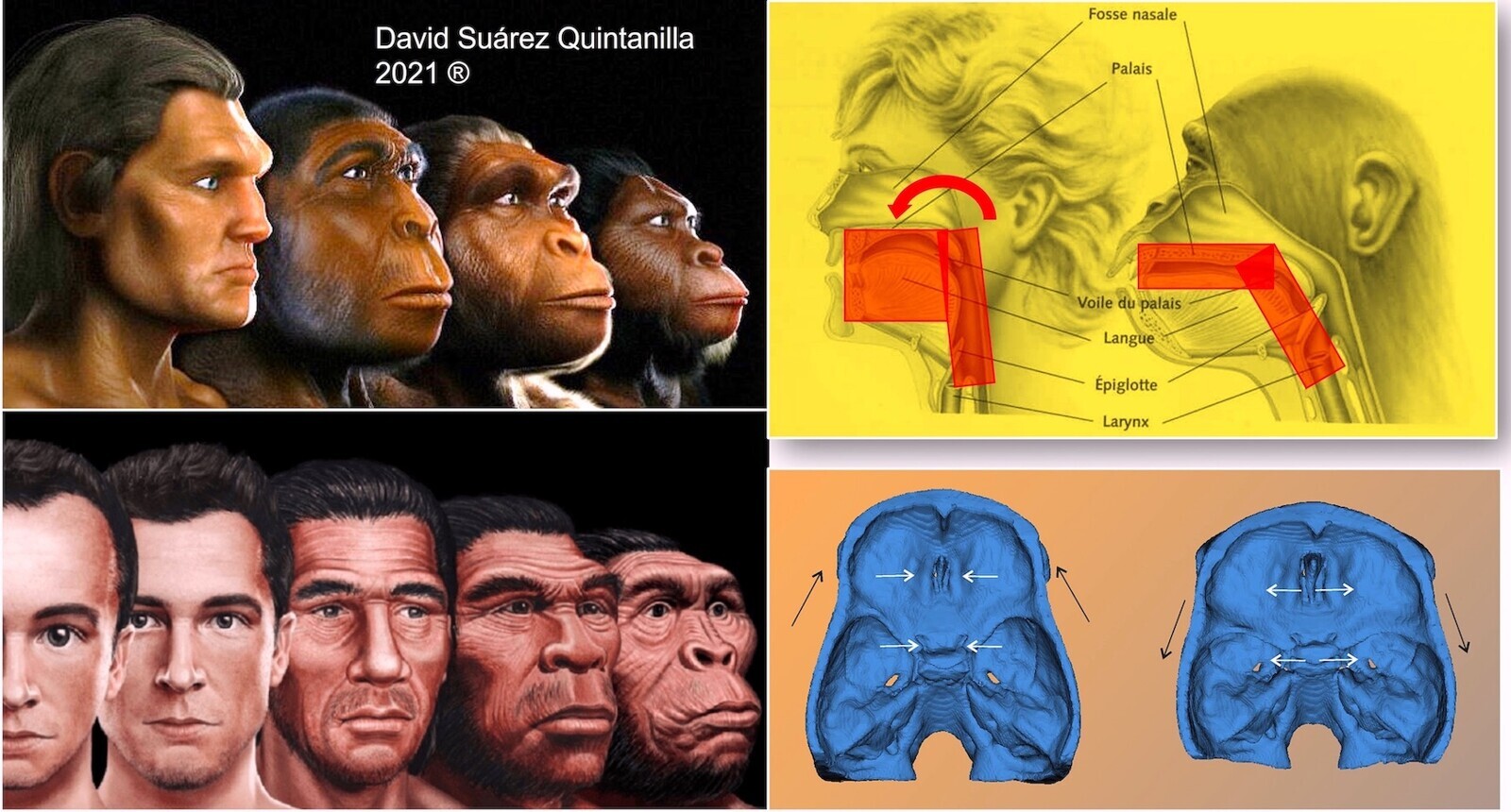 Figura 18. El habla y el desarrollo cerebral subsiguiente obligaron a una verticalización del tubo fonatorio. En mi hipótesis, la separación de ambos procesos maxilares, con una compleja ATM en evolución y adaptación, crea un problema para la oclusión, para la homeostasis oclusal, que la evolución trata de resolver con el activo crecimiento vertical del hueso alveolar. Esta necesidad explica la extraordinaria capacidad de este hueso para la compensación y el camuflaje dentoalveolar.