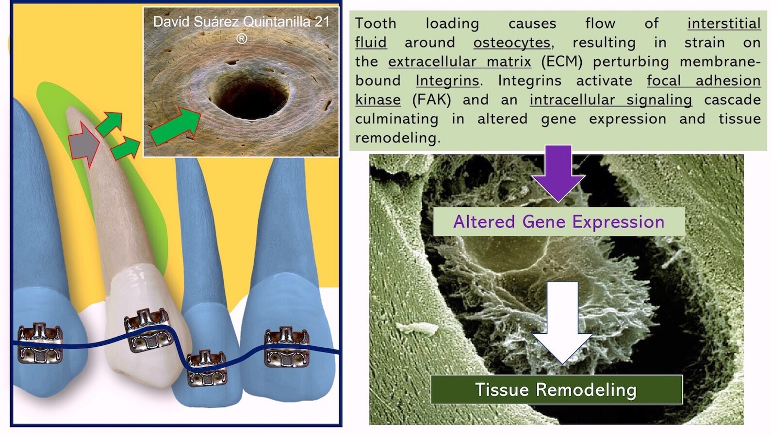 La teoría más clásica, la de presión-tensión, no nos deja hoy satisfechos, si bien es un constructo adecuado para la docencia, donde la presión generaría alteración del flujo vascular, picnosis y verdadera necrosis (la falsa hialinización), y la tensión generaría remodelación del ligamento periodontal (PDL) y aposición de nuevo hueso. Los osteoblastos maduros forman el osteoide o matriz de colágeno tipo I que precede a la mineralización y no debemos de olvidar, en este punto, la acción local de la “viagra ortodóncica”, la sintetasa del óxido nítrico endotelial (eNOS). La síntesis de óxido nitroso tiene un papel capital en la regulación del tono vascular, la diferenciación celular y, por tanto, vale para todo tipo de movimientos y enderezamientos, sea el radicular o el peneal3. Nuestras fuerzas también causan un efecto directo sobre el flujo de los fluidos intersticiales a través de los microcanales óseos, y las integrinas activan la kinasas (FAK) y la señal intracellular, modificando la expresión genética y favoreciendo la remodelación ósea (Figuras 22-23).