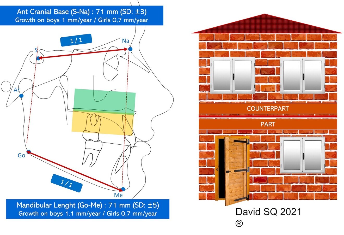 Figura 3. Resulta paradójico el poco conocimiento práctico que hay sobre el crecimiento dentofacial en el ámbito de la medicina y odontología. Existe un lógico equilibrio y una estrecha relación entre las partes y contrapartes de la dinámica craneofacial, como en una casa entre las dimensiones de la planta baja (maxilar) y del primer piso (cavidad nasal y senos paranasales); la base craneal anterior, por ejemplo, se relaciona con la longitud del cuerpo mandibular.