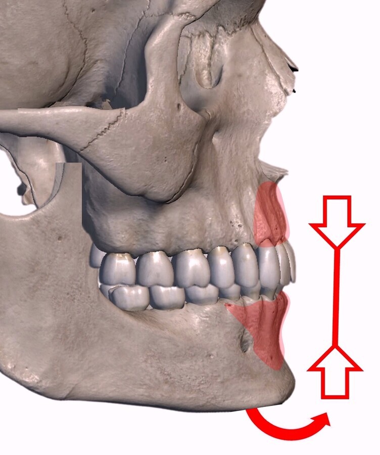Es cierto que el dolicofacial va a heredar una mayor tendencia al crecimiento maxilar vertical y una estructura mandibular con mayor divergencia angular entre rama y cuerpo, pero no debemos olvidar el funcionamiento de su hueso alveolar tratando de compensar el crecimiento de las áreas con mayor predominio genético: la flexión de la base del cráneo favorecida por la sincondrosis esfeno-occipital, el crecimiento del cartílago condíleo o el desplazamiento secundario vertical del maxilar en respuesta a la expansión de los senos (esfenoidal, frontal y maxilar), y demás cavidades neumáticas del viscerocráneo.
