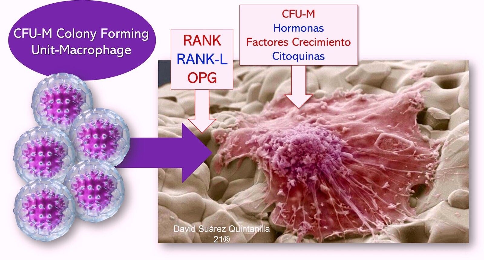 Figura 21. Precursores y maduración del osteoclasto, la célula “tuneladora” encargada de la reabsorción ósea.