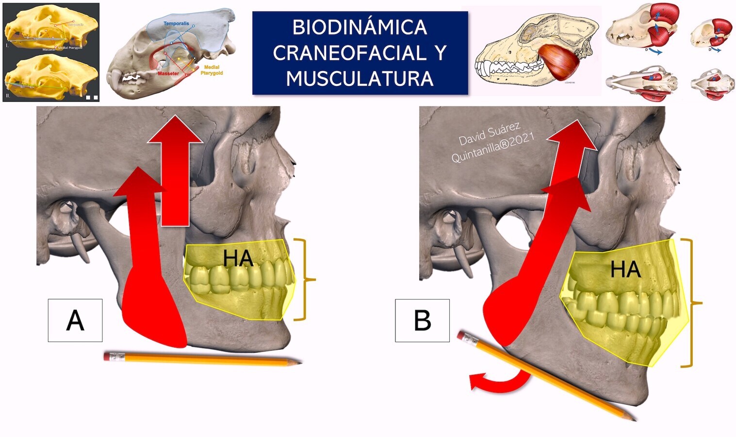 Figura 13. Es triste que la ortodoncia actual olvide las palabras de Melvin Moss de que no hay centros de crecimiento, sino solo lugares, que a su vez están dominados por la biodinámica muscular. Los pacientes braquifaciales (A) presentan tirantes musculares muy efectivos, incluso demasiado efectivos, que condicionan la falta de desarrollo vertical del hueso alveolar posterior y un crecimiento mandibular horizontal. Los pacientes dolicofaciales (B), muy al contrario, exhiben un gran desarrollo vertical dentoalveolar, unos tirantes musculares de menor eficiencia biomecánica y un crecimiento vertical de la cara.