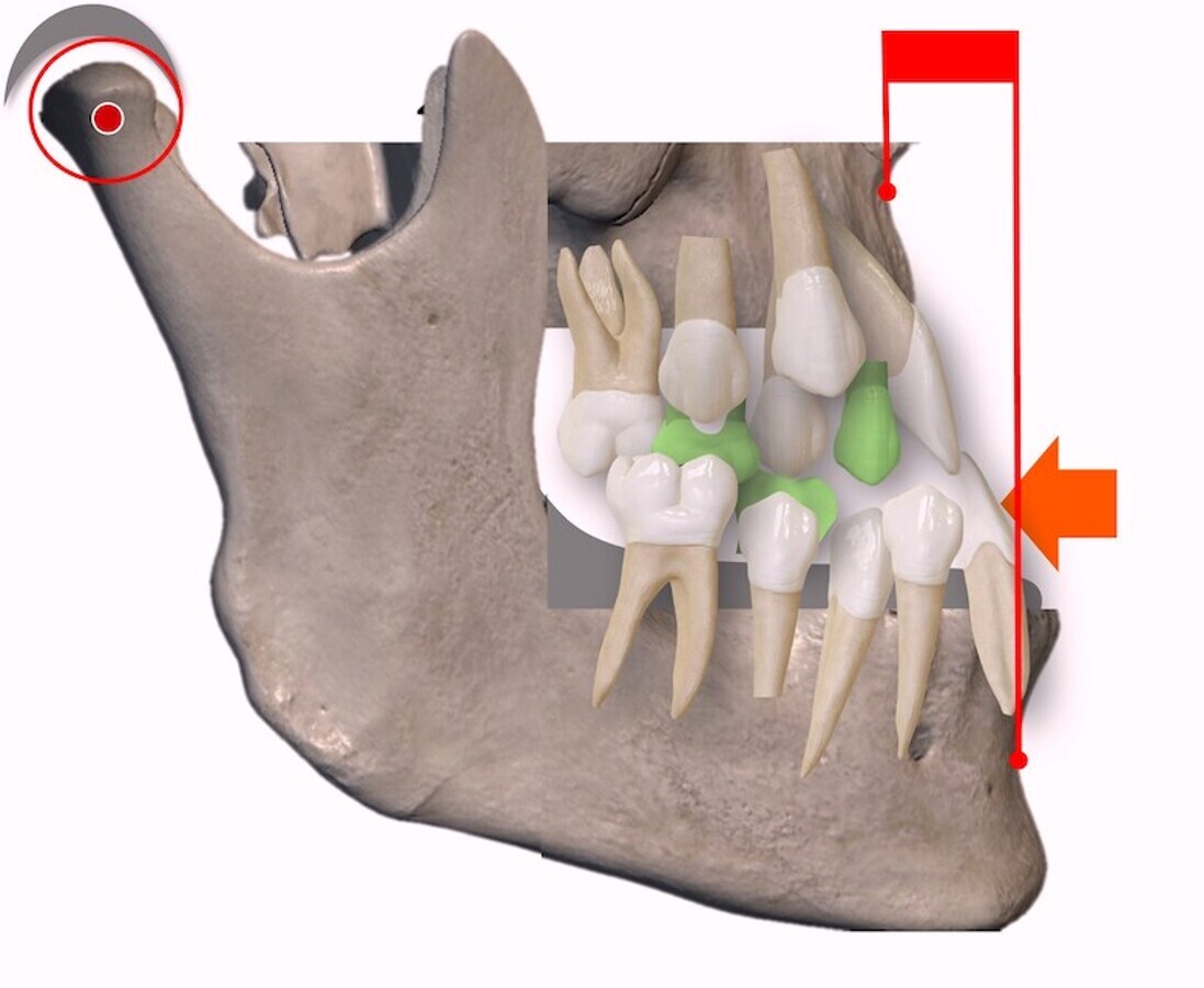 El proceso alveolar actúa de dos maneras3: de manera directa, como un colchón compensador entre bases maxilares, al que me he referido con anterioridad, que va a tratar de compensar o camuflar las alteraciones oclusales, de encaje vertical, producto de la discrepancia esquelética, de la maloclusión esquelética; y, por otro lado, modificando el eje terminal de bisagra condilar.