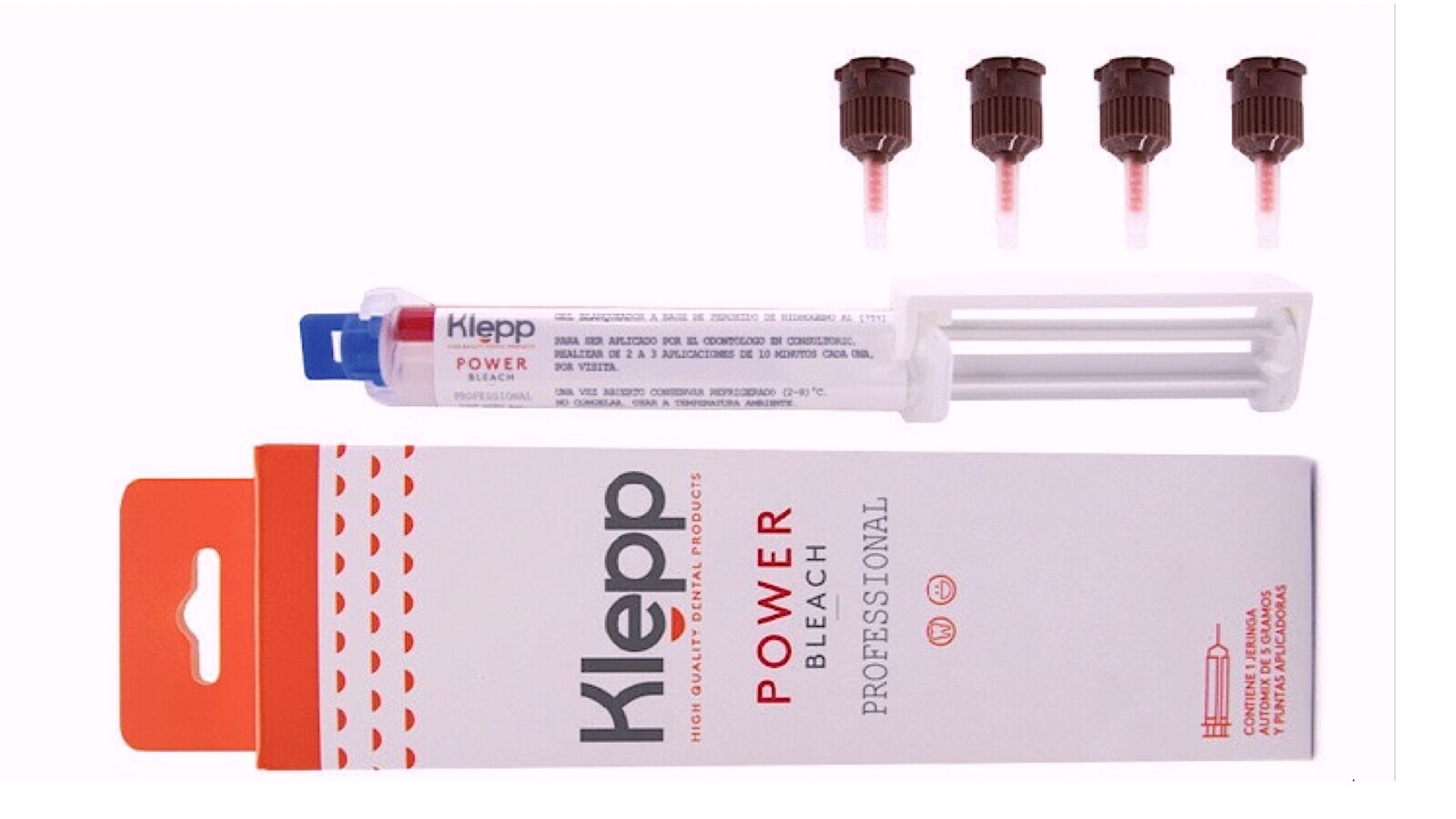 Figura 2. El peróxido de hidrógeno en concentraciones del 3 al 6% puede ser usado en el hogar por el paciente, supervisado por el odontólogo cuando vaya la consulta. A concentraciones mayores, como la de la imagen al 35% con jeringa automezclante (automix), deben ser manipuladas por el odontólogo, dado el riesgo para los tejidos duros y blandos.