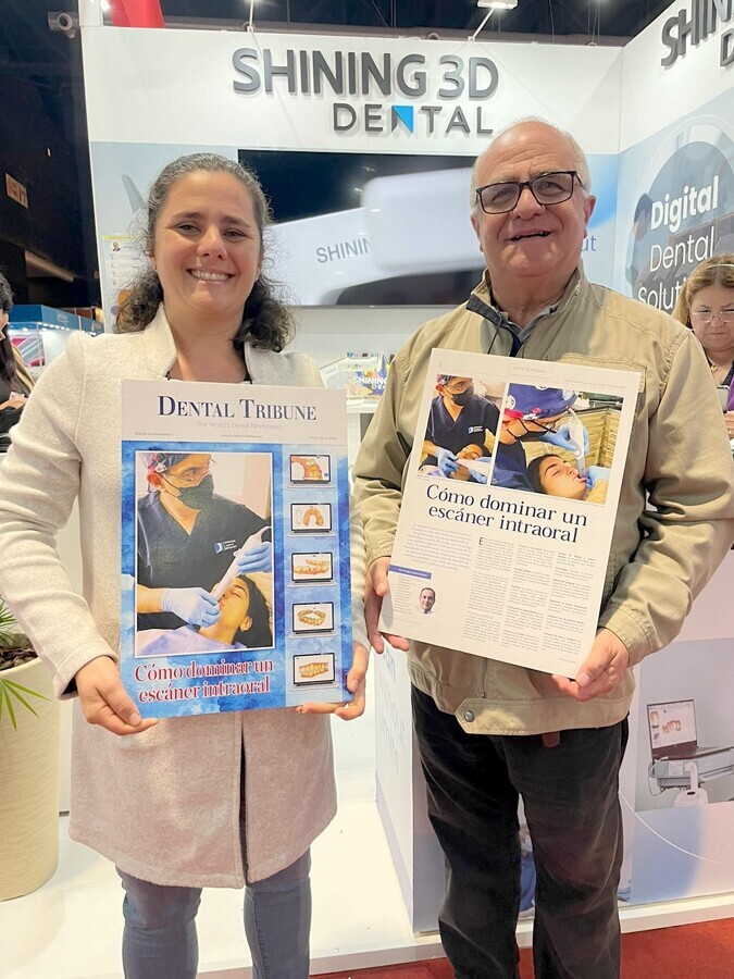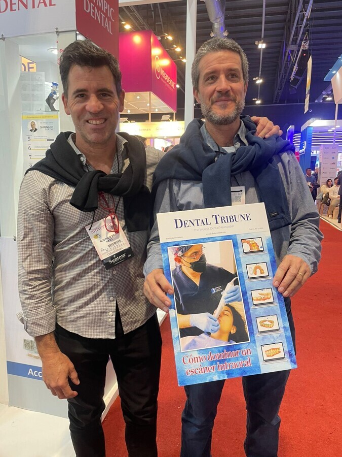 Dos odontólogos posan con la edición de Dental Tribune dedicada a "El arte de escanear".