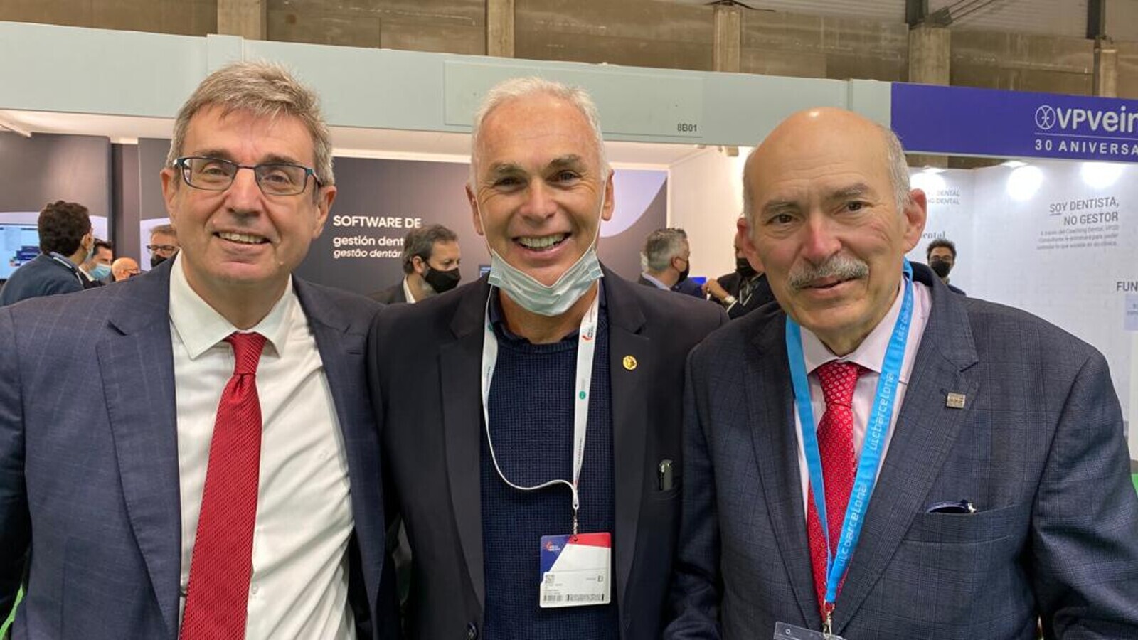 Los doctores David Suárez Quintanilla (centro) y Enrique Jadad Bechara (derecha) muestran junto a Javier M de Pisón de Dental Tribune, el enjuague bucal Xyntrus que desactiva el virus del SARS-CoV-2 en la boca, un producto revolucionario que fue presentado en EXPODENTAL 2022.