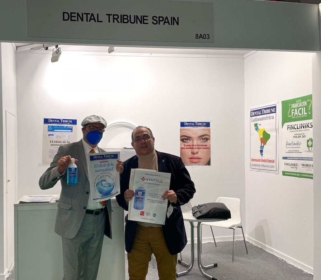 El Dr. Enrique Jadad (derecha), creador del colutorio Xyntrus, ofreció muestras de este producto que ayuda a reforzar la seguridad de la clínica odontológica. Junto a él aparece el director de Dental Tribune España y Dental Tribune Latinoamérica, Javier M. de Pisón.