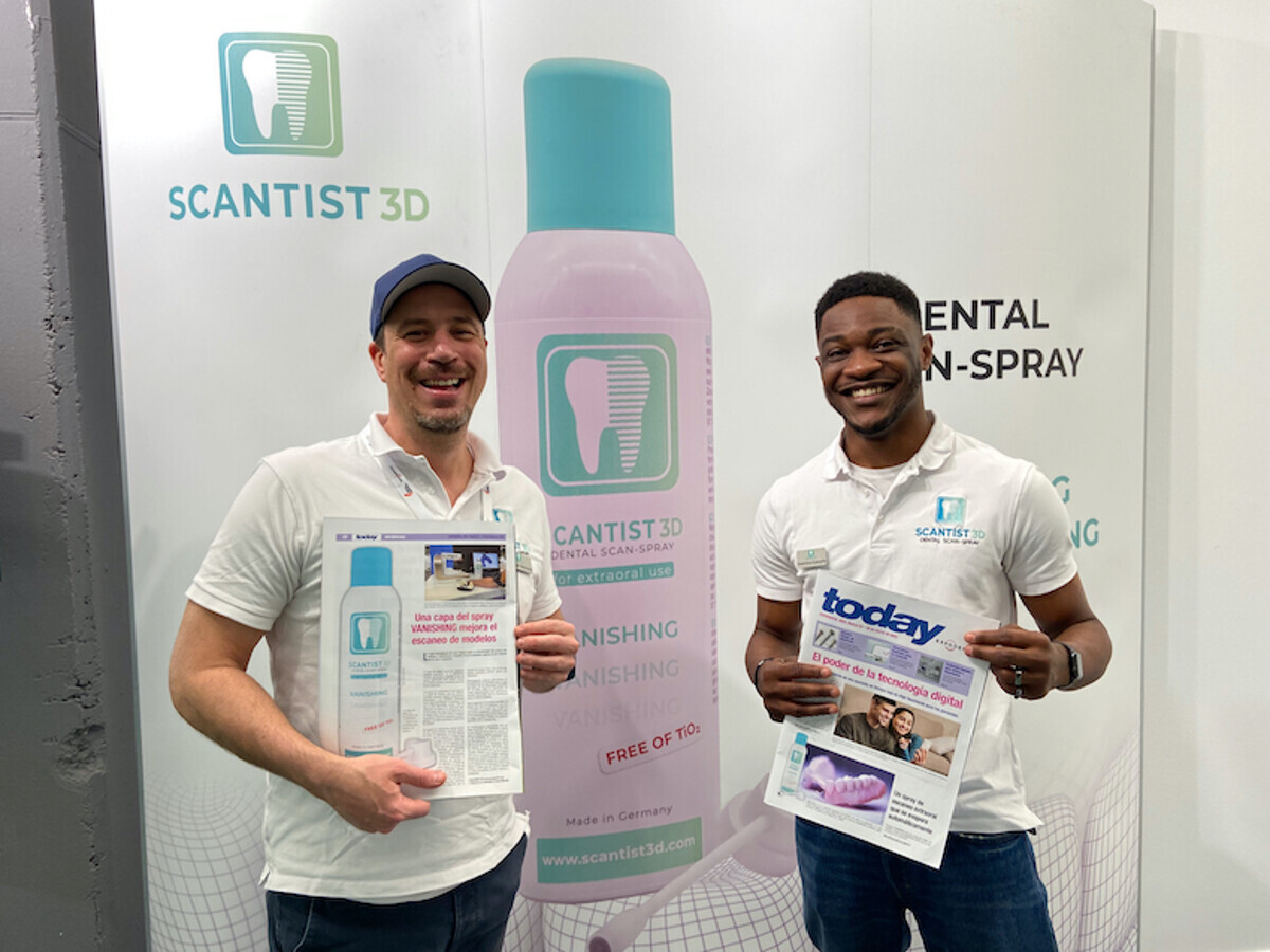 Chris Neumann y Valentine Ezenachi enseñan el polvo para escanear que se desvanece Scantist3D, el cual fue lanzado en la feria de Madrid.