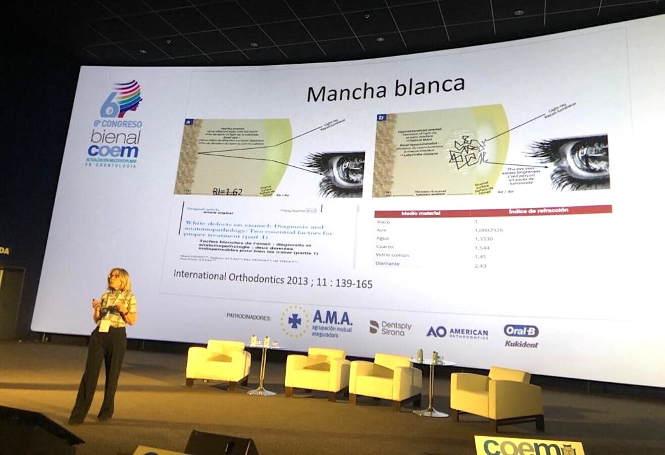 La Dra. Paola Beltri durante su ponencia en la Sesión COEM Sociedades Científicas “Lesiones de mancha blanca. ¿Por qué se producen? ¿Cómo se tratan?"