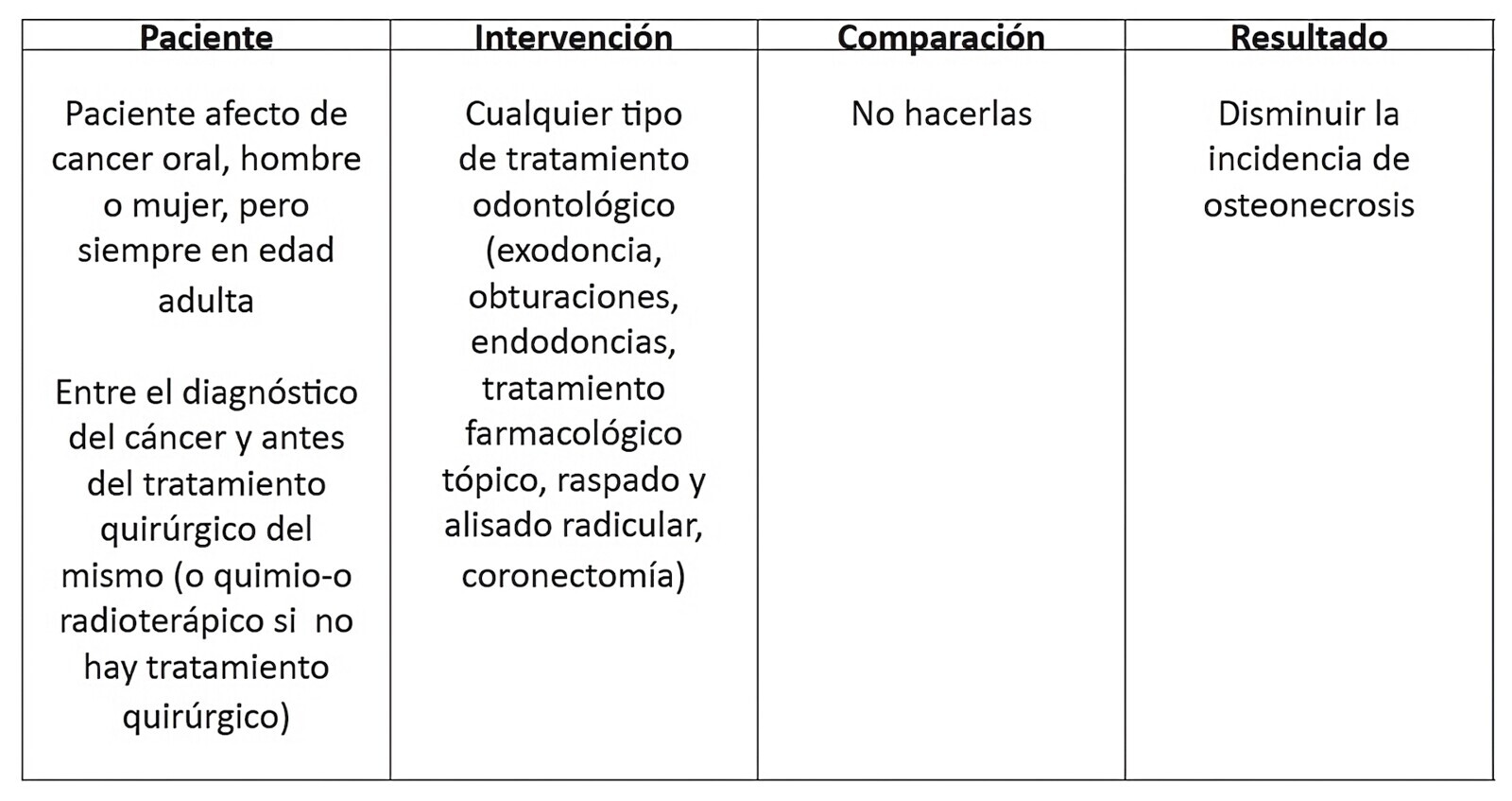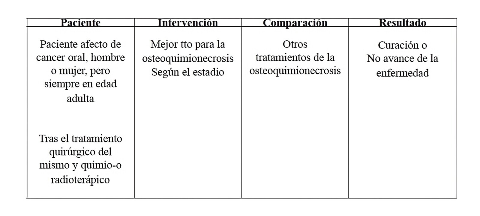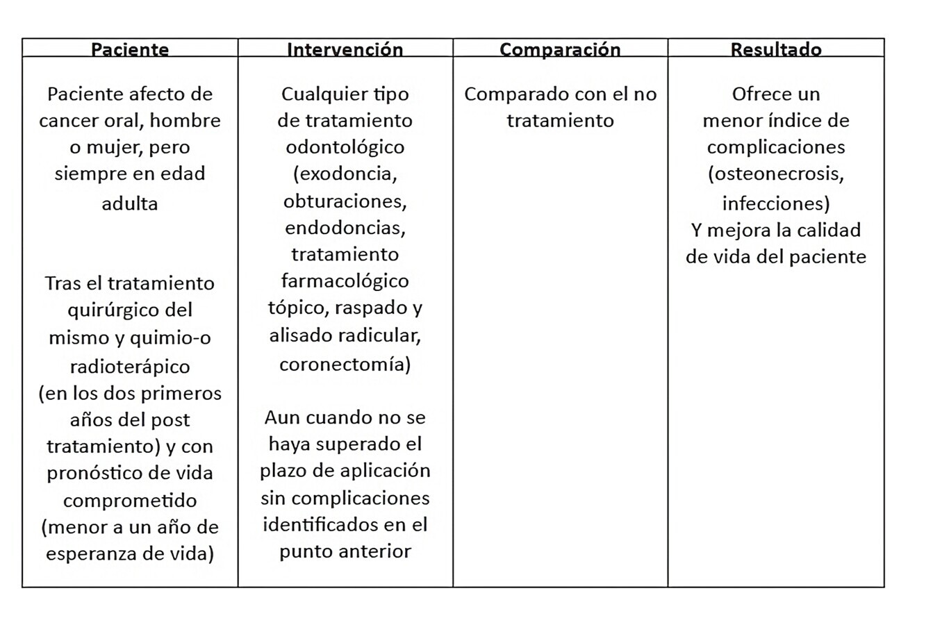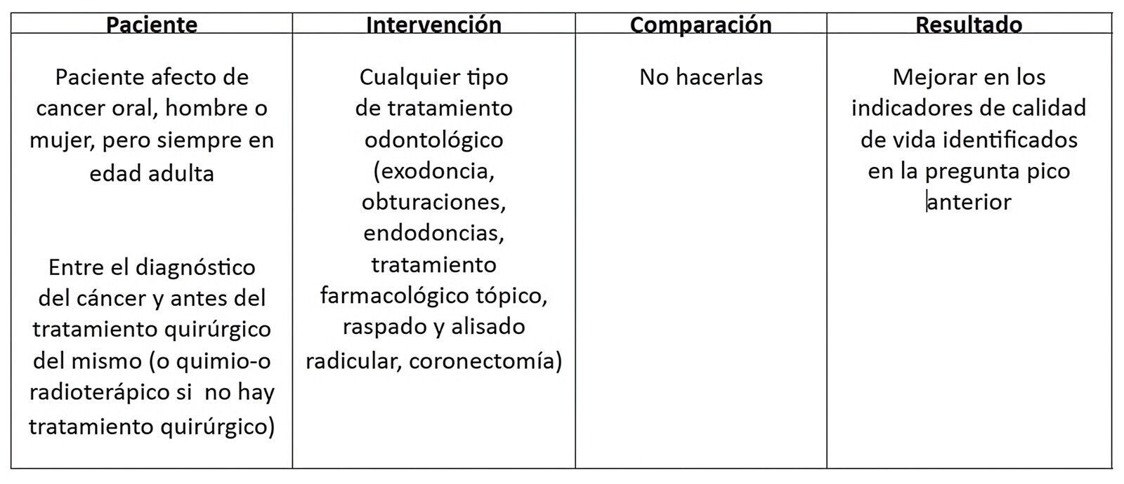 Las respuestas a las Preguntas Pico en la tabla superior son una contestación a los términos de las mismas preguntas realizadas en la búsqueda bibliográfica.