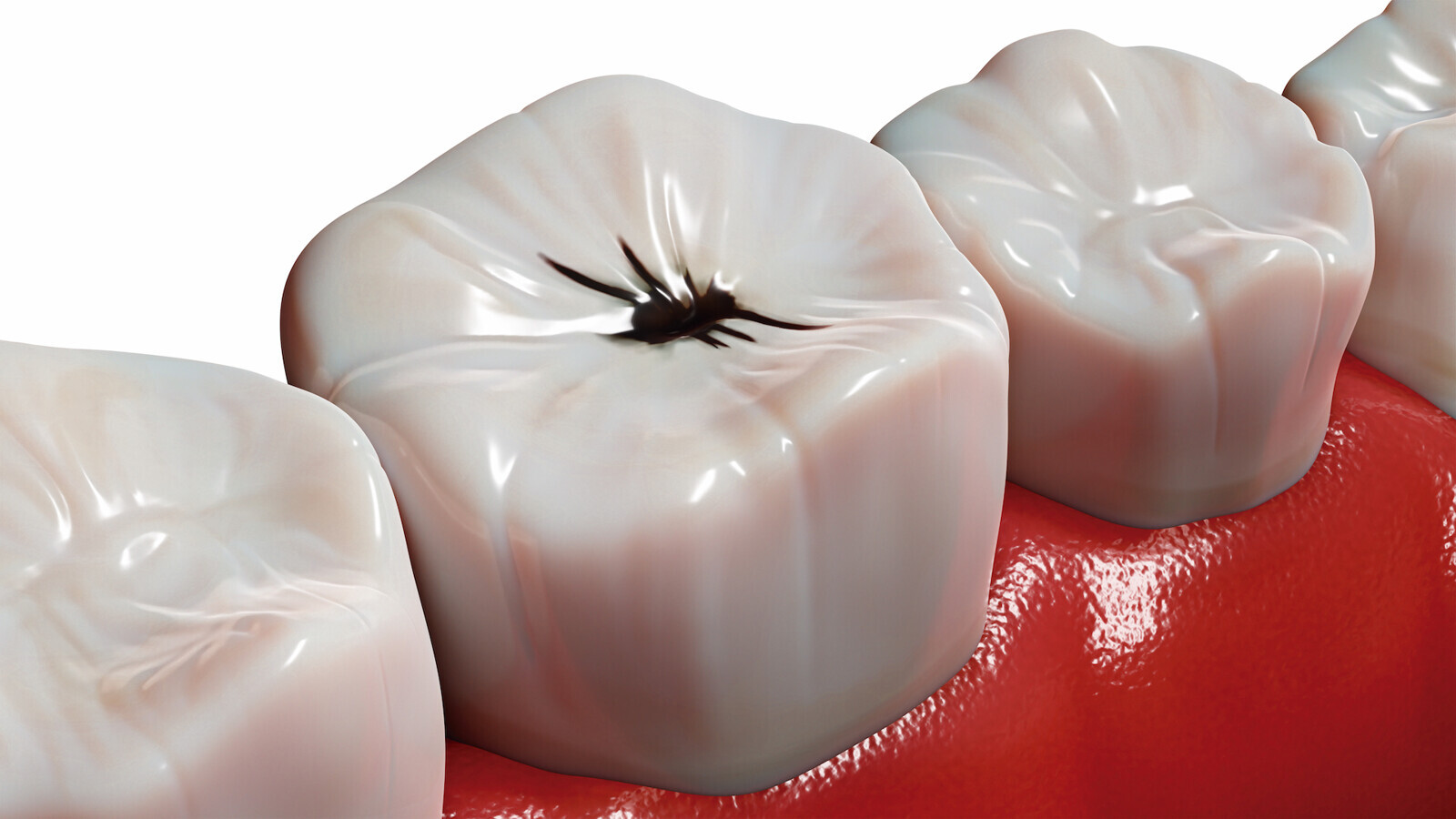 Tooth damaged by caries, close-up. Human jaw, 3d render. Medically accurate dental 3D illustration