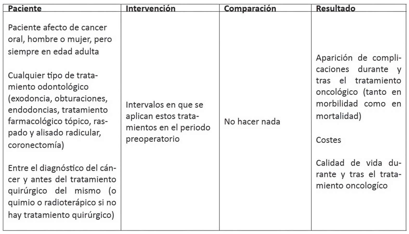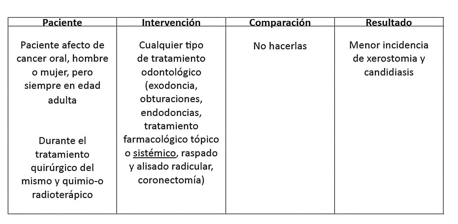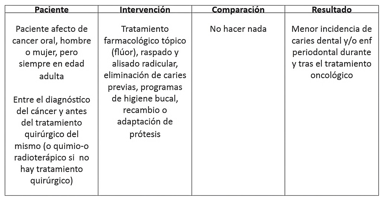 Pregunta Clínica 5. ¿Qué actuaciones en el periodo preoperatorio pueden disminuir la incidencia de caries o enfermedad periodontal en pacientes adultos oncológicos orales?