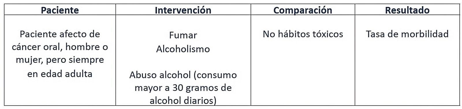 Pregunta Clínica 1. ¿El tabaquismo y el abuso de alcohol está relacionado con una mayor tasa de complicaciones orales en pacientes adultos oncológicos orales?