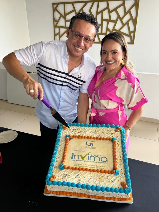 Guillermo Rhenals con su esposa Sandra Soto, que dirige el área financiera del laboratorio, celebran haber obtenido en 2024 el registro de INVIMA, el instituto de control sanitario del gobierno colombiano. En la imagen inferior, celebrando la ocasión con empleados de la empresa.