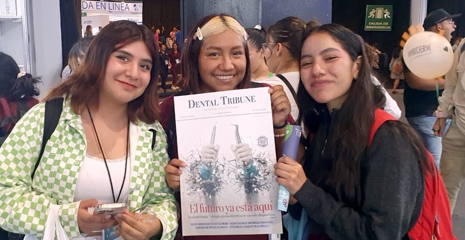 Tres estudiantes de odotontología con la portada de una edición de Dental Tribune Latinoamérica dedicada a la tecnología piezoeléctrica, la cual se puede ver online.