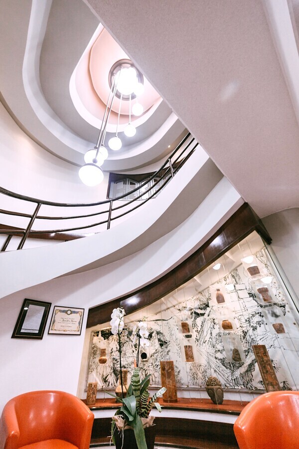 Importancia del entorno: la elegancia arquitectónica de las curvas de la escalera, la vitrina con piezas de cerámica precolombina, que conectan con el pasado y lo ponen en valor, y los modernos sillones color naranja son señales claras de los valores de esta clínica dental guatemalteca. Foto: Centro Dental Multimédica