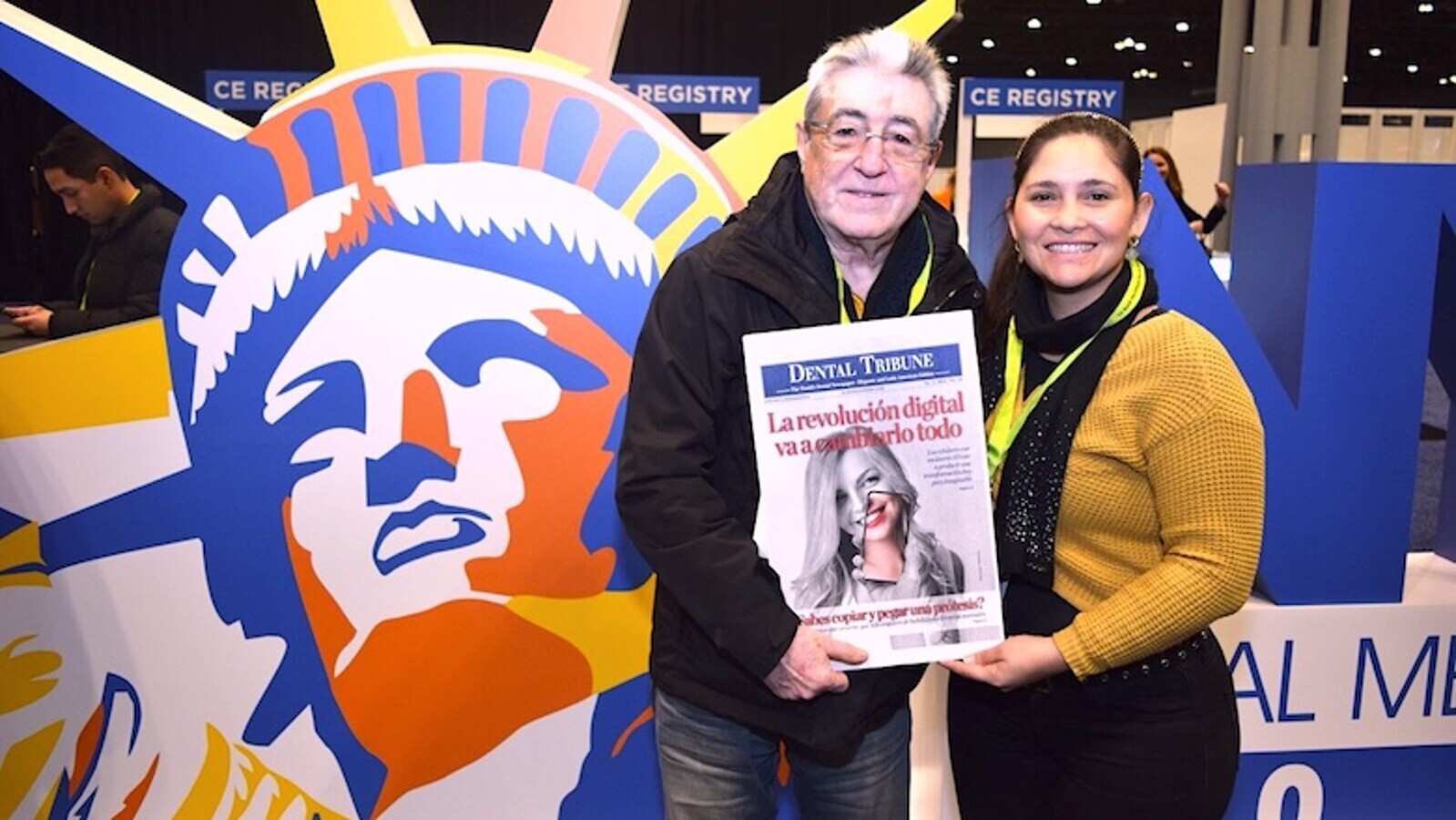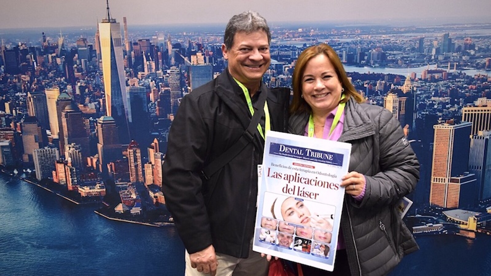Los doctores Joel Gerrardo Gómez e Isabel Sepulveda, de Miami, Florida, posan contentos en Nueva York con un ejemplar de Dental Tribune. (Foto: José Antonio Rosario)