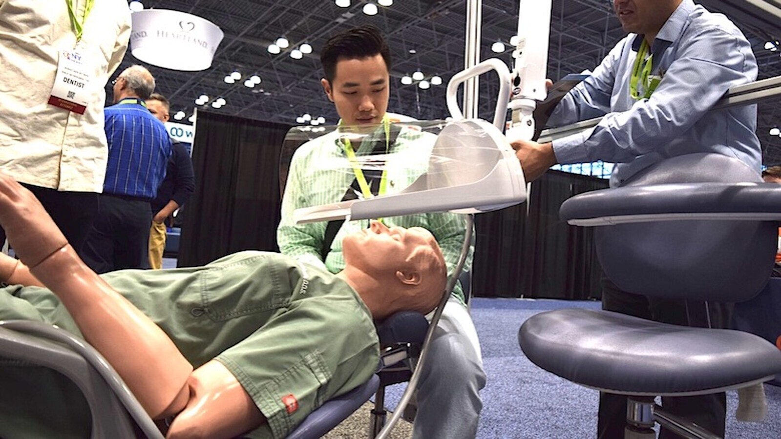 Demostración en la exposición neoyorquina de la eficacia de una pantalla de protección contra aerosoles, que ofrece una odontología más higiénica y segura. (Foto: José Antonio Rosario)
