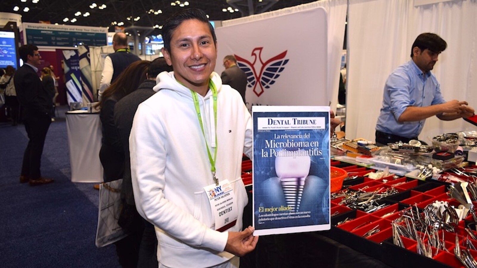 El odontólogo ecuatoriano Peter Valverde Morales, que ejerce en Guayaquil, muestra contento en Nueva York un ejemplar de Dental Tribune sobre el microbioma. (Foto: José Antonio Rosario)