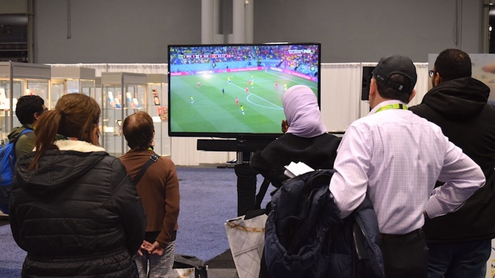 Los aficionados al fútbol encontraron la manera de ver el mundial, ya que la organización del congreso instaló varias pantallas para ver los partidos que se disputaban. (Foto: José Antonio Rosario)
