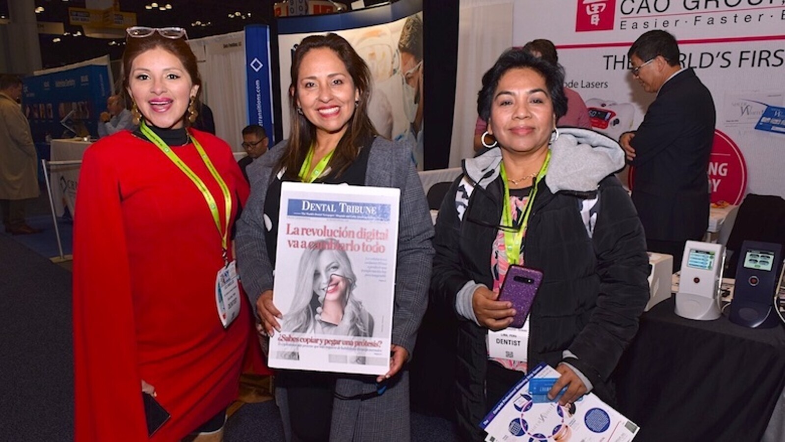 Delegación peruana en Nueva York. Las doctoras Luz Angelica Infante Rumiche, de Sullana; Primitiva Villanueva Durand, de Lima y Karina Rojas, también de la capital peruana, muestran orgullosas un ejemplar de Dental Tribune dedicado a la odontología digital. (Foto: José Antonio Rosario)