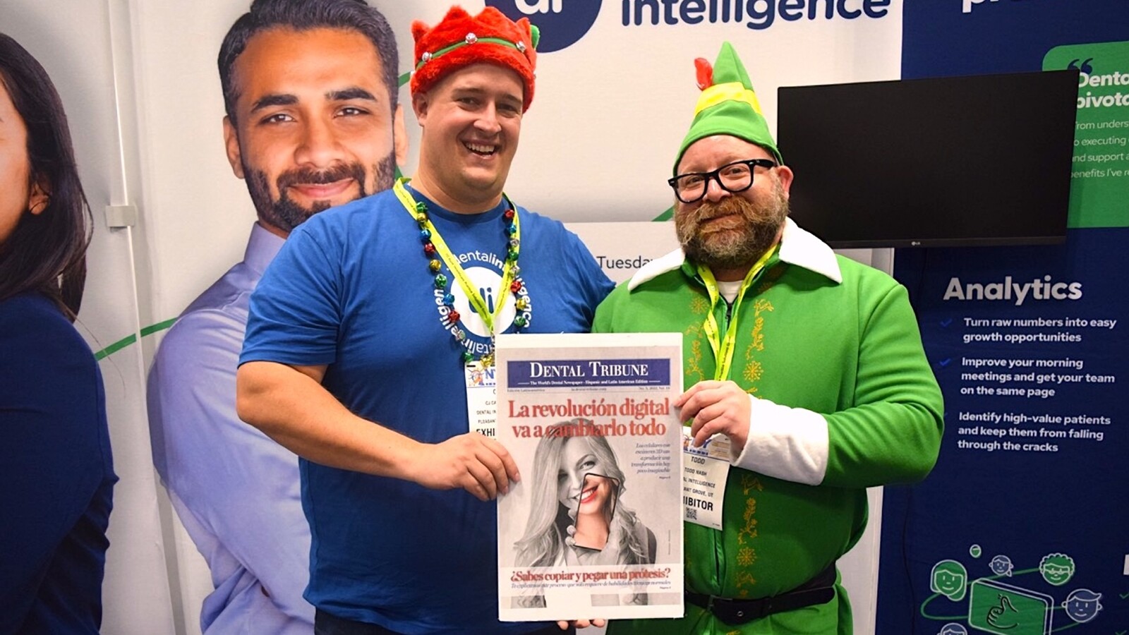 El propio Papá Noel y un duende muestran en Nueva York que no hay mejor regalo navideño para conocer toda la actualidad de la odontología que leer Dental Tribune. (Foto: José Antonio Rosario)