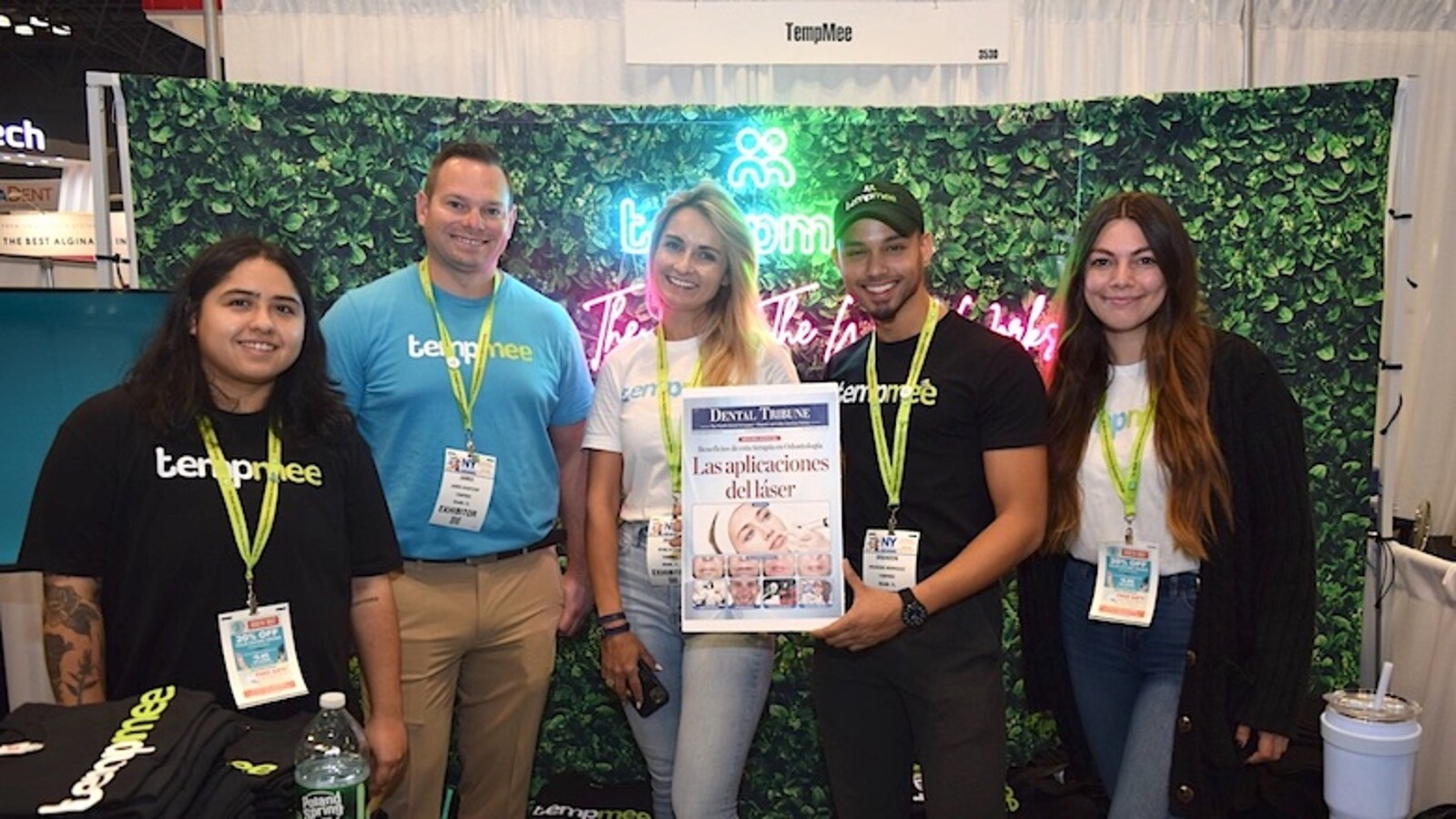 Los coordinadores de la empresa "tempmee" de Miami, Florida, que ofrece trabajos temporales para odontólogos e higienistas, posan con el ejemplar de Dental Tribune sobre el Láser en Odontología. De izq. a der. aparecen, Sally Hunter, Iryna Ryzhuk, Cassidy Miller, Brandon Rodríguez y James Shantzer. (Foto: José Antonio Rosario)