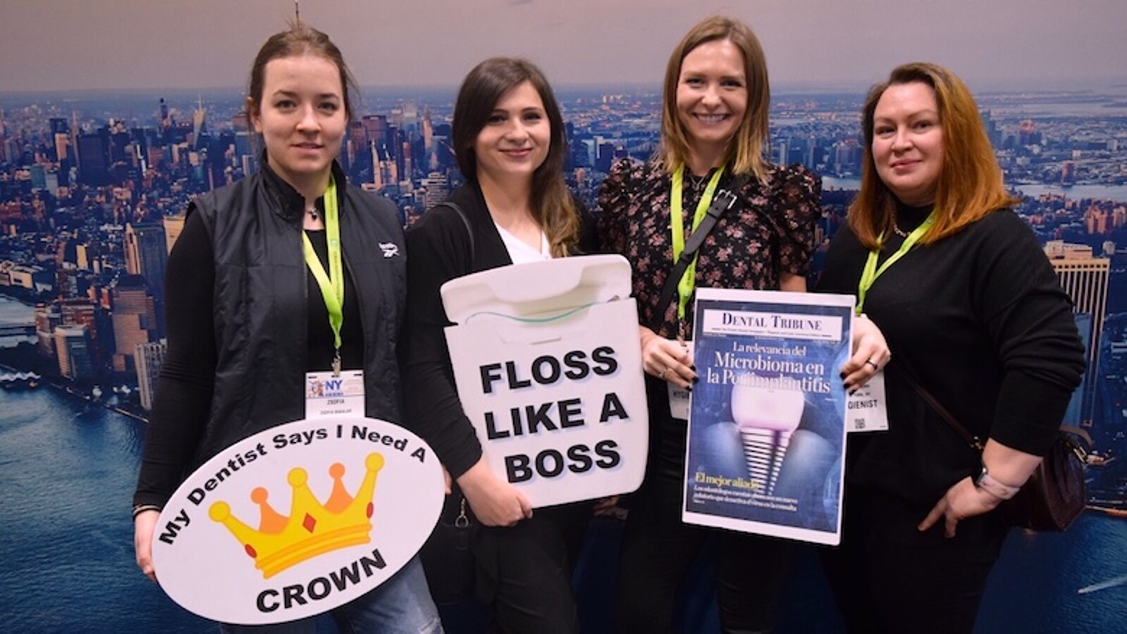Estas higienistas y asistentes dentales posaron para una foto con un fondo de Nueva York y un ejemplar de nuestra publicación. Ellas son: Ina Kazhanouskaya, Paulina Parzych, Zsofia Bakalar e Irina Kondra. (Foto: José Antonio Rosario)