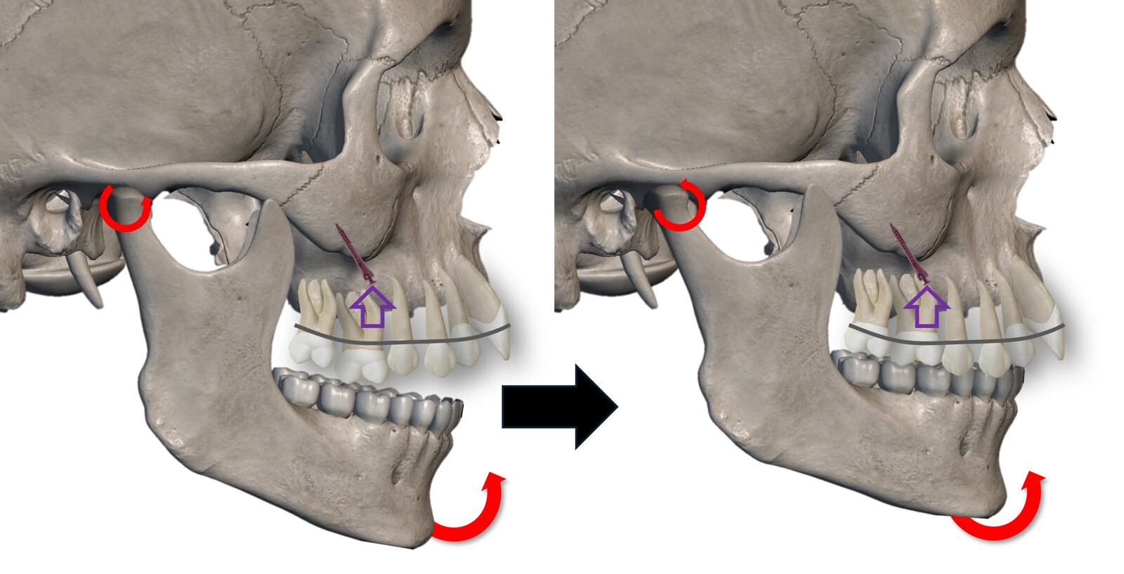 Con los microimplantes extraalveolares e infracigomáticos DSQ podemos favorecer la pasiva anterorrotación mandibular y el cierre de la mordida. Esquema de antes (izq.) y después de la intrusión dentoalveolar (der.).
