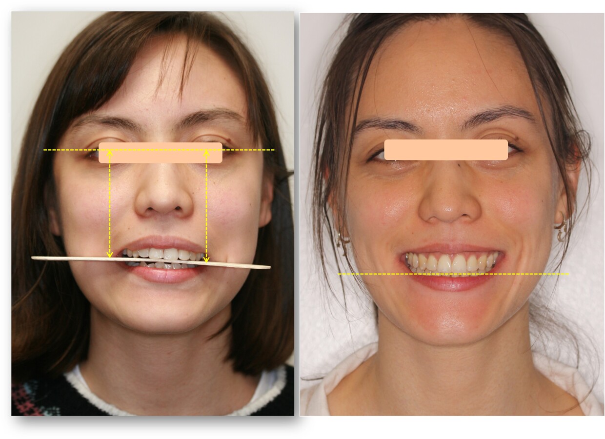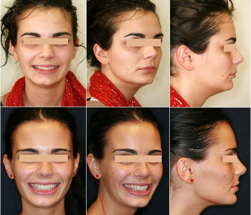Cambios faciales notables en esta paciente a pesar de su edad al inicio del tratamiento de ortopedia mandibular, gracias al desarrollo vertical del hueso alveolar y el "post-puberal growth spurt" característico en algunas mujeres después de la adolescencia.