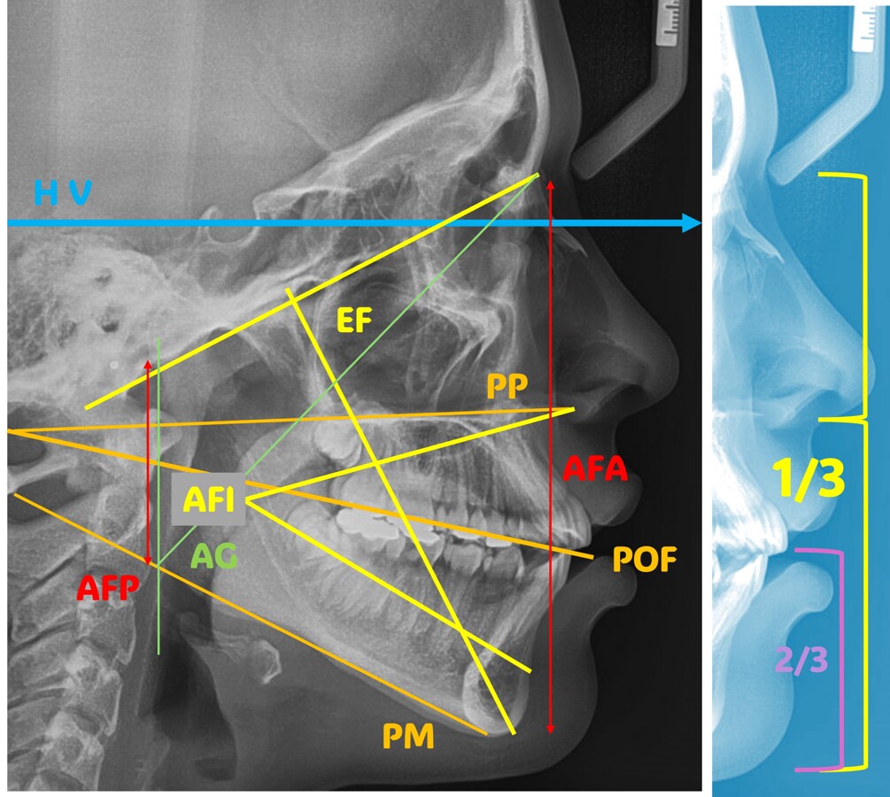 La determinación del patrón facial en una simple telerradiografía resulta fascinante y se basa en medidas lineales verticales (relación del tercio facial medio con el inferior de 45%/55%) o angulares (Horizontal Verdadera con el Plano Maxilar – ENA-ENP-, el Plano Oclusal Funcional y el Plano Mandibular -Go-Me-), así como en determinadas medidas muy representativas (ángulo Goníaco, Eje Facial y Altura Facial Inferior de RM Ricketts, etc.). Nos gusta la cefalometría de A Björk-Jaraback para la caracterización del biotipo facial y la tendencia de crecimiento. Pero no hay que complicarse la vida a la hora de determinar el problema esquelético vertical: basta con comparar el paralelismo o divergencia de los principales planos cefalométricos horizontales. Una parte de la modificación cefalométrica de estas relaciones, gracias a nuestros aparatos, se circunscribe a la interacción entre crecimiento vertical posterior dentoalveolar y rotación condilar (nueva posición mandibular mantenida)11-13.