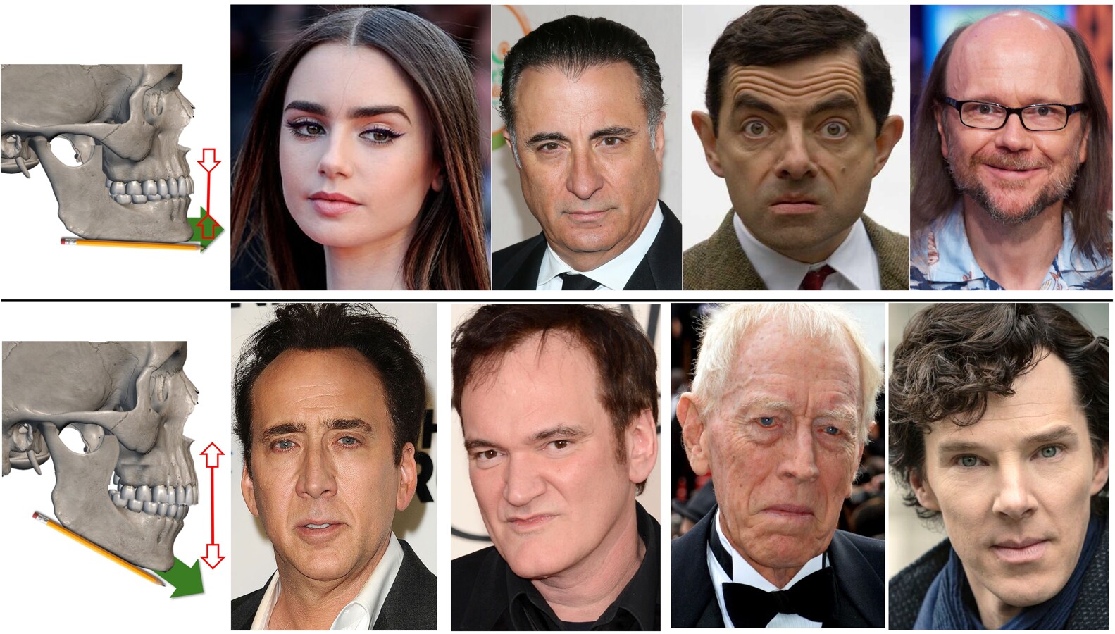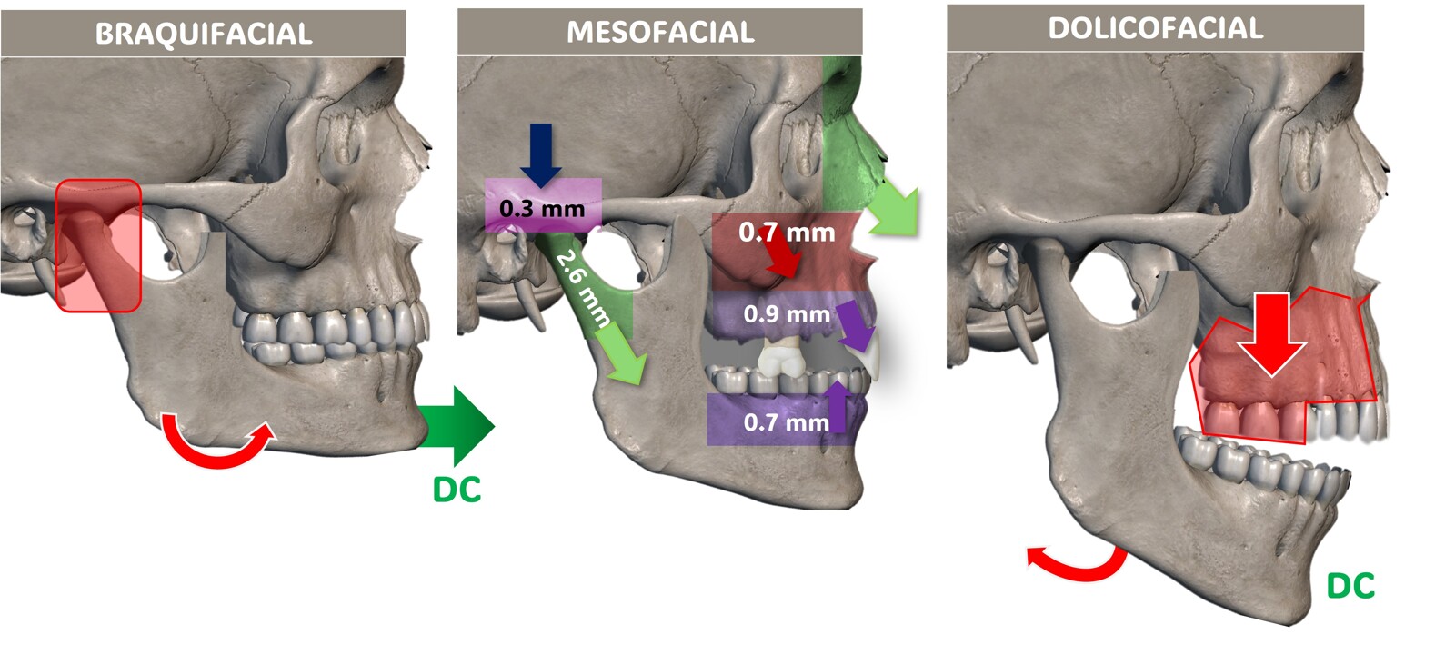Dos elementos son importantes para su determinación: la forma original del cráneo (dominio de las medidas transversales en los braquifaciales y de las sagitales en los dolicofaciales) de claro componente genético, pero modificable por la epigenética (deformaciones rituales craneales de las culturas egipcias, precolombinas de Meso y Sudamérica, indios norteamericanos) y la forma de la mandíbula, en especial la altura de la rama ascendente y el ángulo goníaco.