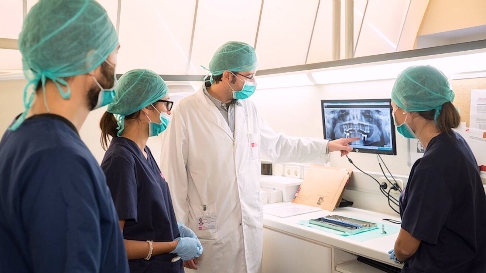 Un profesor de la Facultad de Odontología de UIC Barcelona explica a sus alumnos un caso de implantología oral.