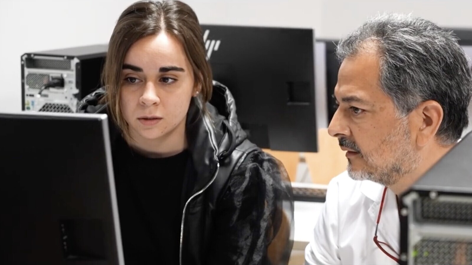 El Director del Área Restauración Dental, Dr. Miguel Roig, explica a una alumna los ajustes que hay que realizar en un diseño digital. (Foto: UIC Barcelona)
