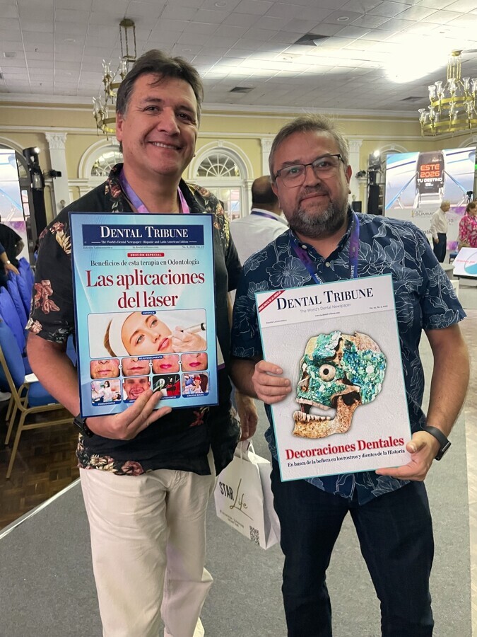 El conferencista Juan Fernando Uribe y su padre, Luis F. Uribe, posan con ejemplares de Dental Tribune.