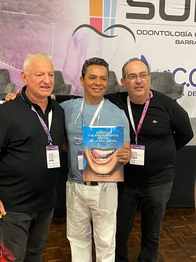 El Dr. Alfredo Borja sostiene el libro "Estética y blanqueamiento dental en la Era Digital", junto a dos de los autores del mismo, los doctores Sergio Kohen y Enrique Jadad.