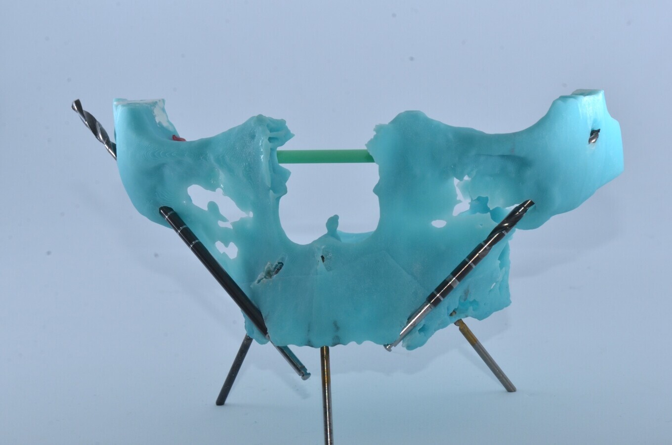 En base a esto, se pudo realizaruna distribución pentagonal de implantes para sostener 12 dientes maxilares, con dos implantes inclinados en la pared anterior del seno maxilar a nivel molar, dos implantes cigomáticos en la posición de los caninos y un implante nasopalatino en la posición de los incisivos centrales, utilizando los implantes GM Helix y GM Zygoma de Neodent.