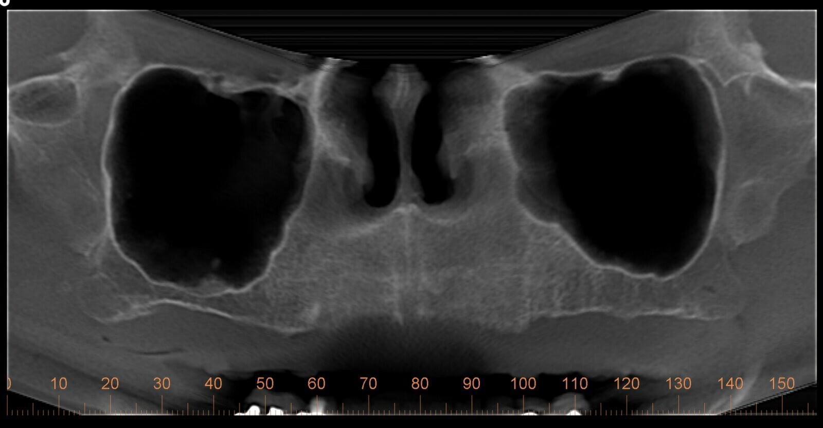 Se observó la permanencia del hueso alveolar con respecto a la pared anterior del seno maxilar y la buena correlación sagital entre los dientes anteriores y la posición de la cresta alveolar, que, aunque era delgada, se encontraba en una relación inmediata, no para sostener implantes convencionales, sino para ser atravesada por un implante cigomático en la posición de los caninos, y la presencia de hueso residual relacionado con la premáxima alrededor del conducto nasopalatino, área esencial para posicionar un implante convencional.