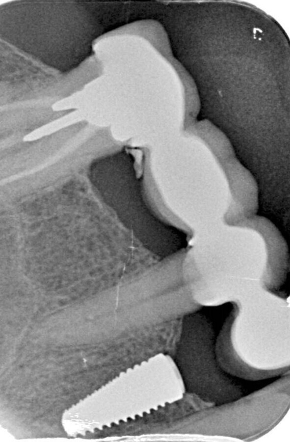 Fig. 4. Situación radiográfica después de la colocación de la corona final, seguimiento de tres meses.