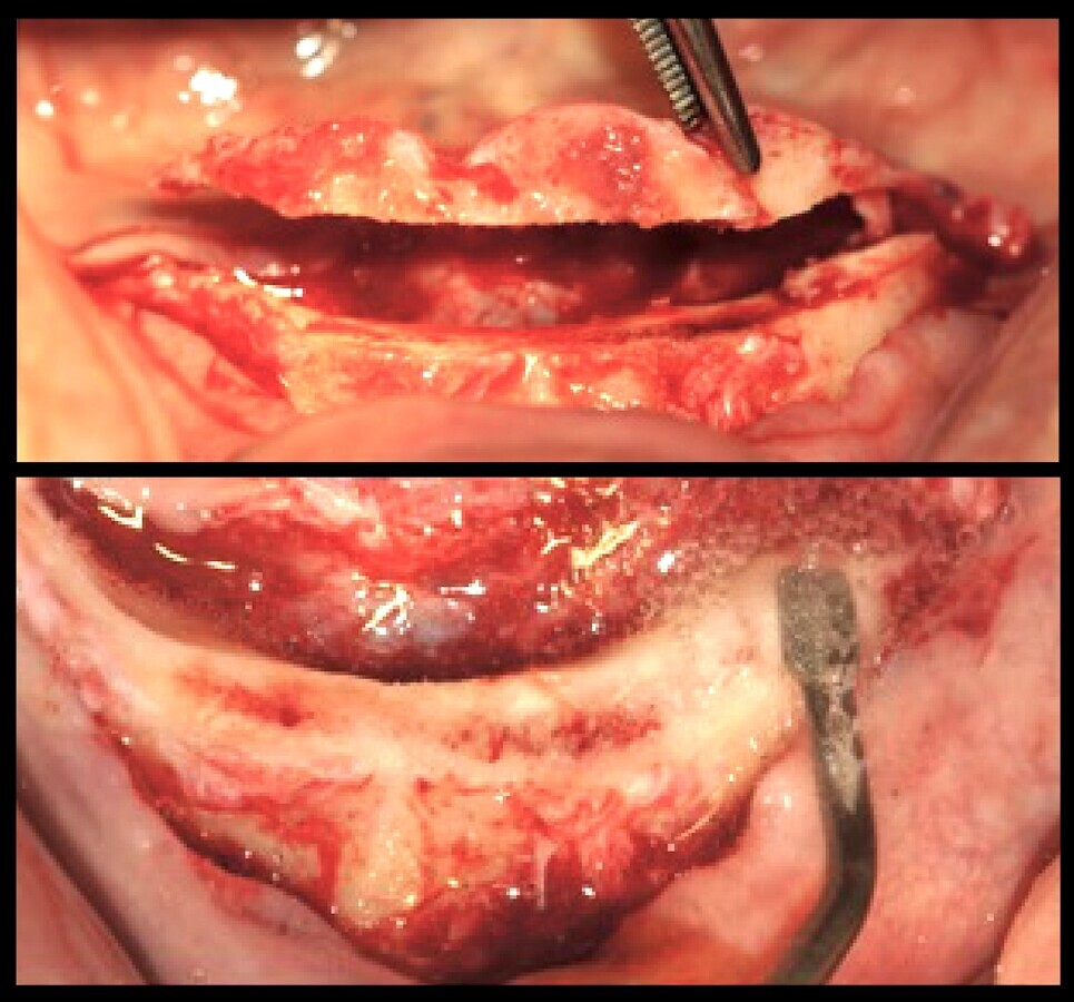 El procedimiento quirúrgico se inició con la asepsia y antisepsia del campo operatorio y del paciente. A continuación, se colocó anestesia infiltrativa a nivel de la proyección de salida de los agujeros mentonianos, se procedió con la incisión y decolado. Se realizó la delimitación y regularización del reborde óseo mediante el inserto aserrado B7 y el subsiguiente remodelado del reborde crestal mediante el inserto plano diamantado S1 del piezoeléctrico Piezomed (W&H) (Figuras 4 y 5).
