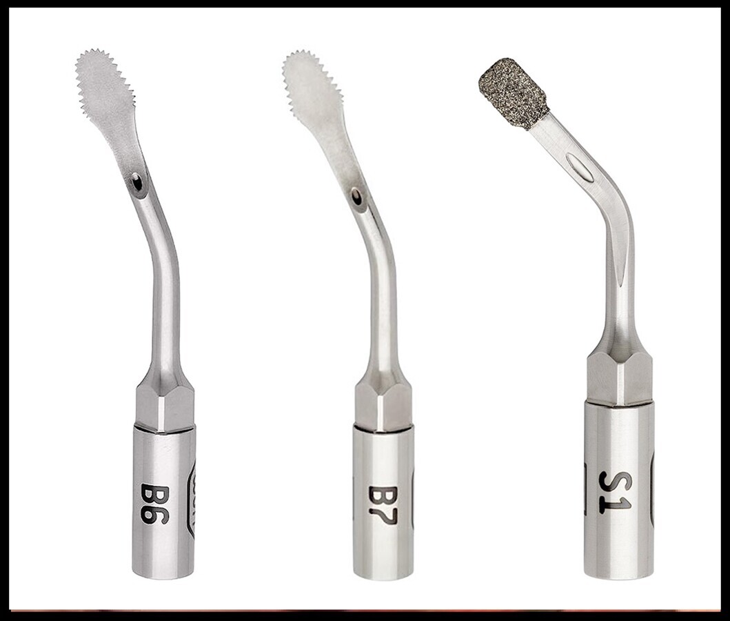Figura 2. Recontorneo gingival y alargamiento de corona clínica mínimamente invasiva mediante cirugía piezoeléctrica, donde se remodela el hueso sin elevar grandes colgajos (a). Se utilizaron los insertos de piezoeléctrico P2LD de W&H (b).